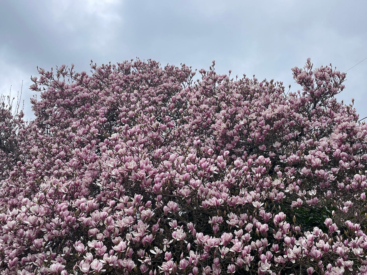 Spring is my favorite season, I think, because it comes even when we’re not ready. Here on the coast, it's well underway. The azaleas are are coming out of the closet. My neighbor’s magnolia tree, a burst of pink. I planted some cabbage and broccoli out in the beds a week ago, and then yesterday it hailed. When the sun came out later that day, I checked on the crops. Some carried puncture wounds, but they all stood tall, proud.
