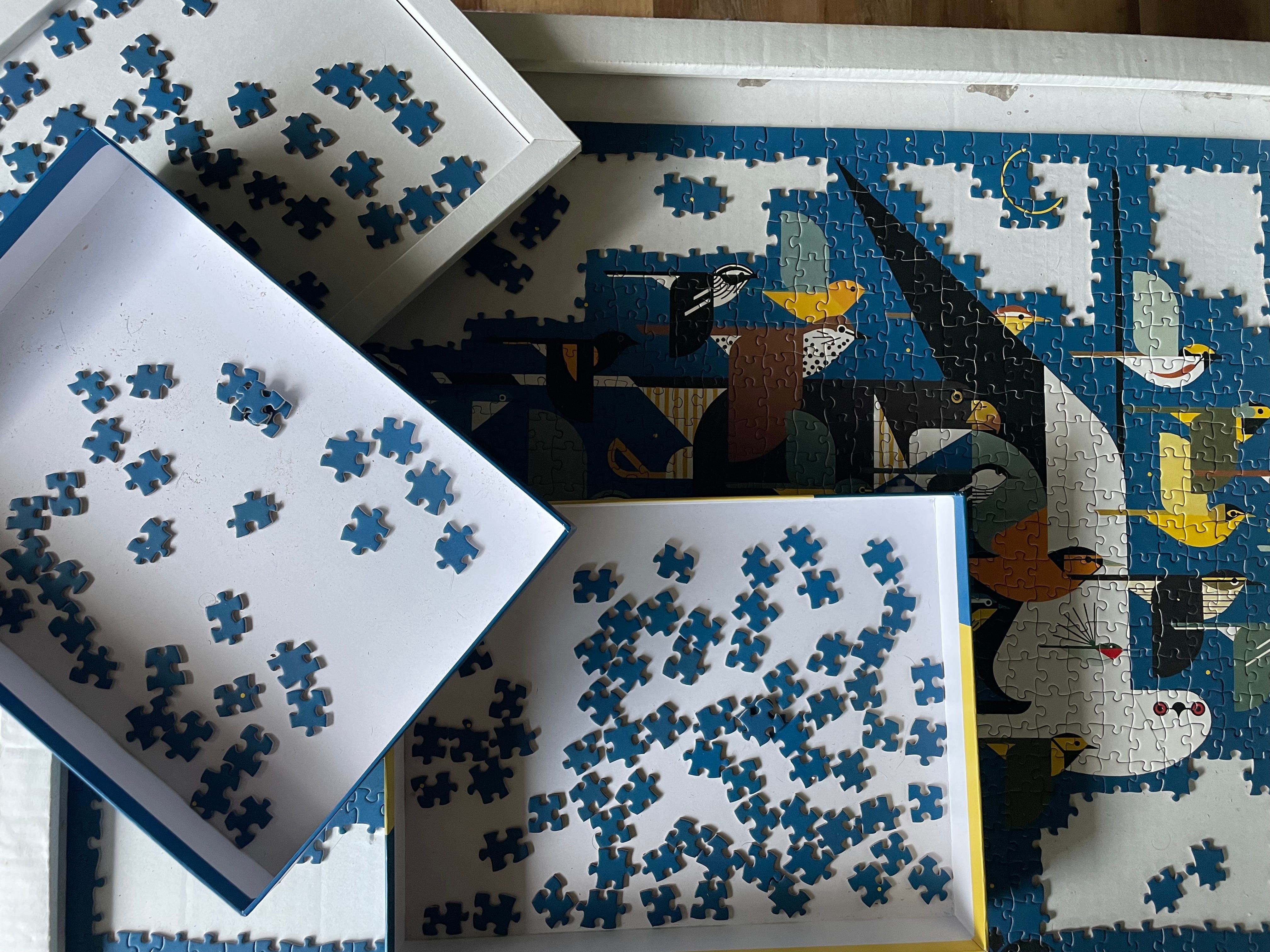 All the pieces that are left for me to do are blue. I've been working on this puzzle for two months now, and it has become a slow meditation of looking at the outline of pieces to find their unique features—a sloped edge to the right, a rounded corner, a narrow rectangular shape, an overly large peg. I use this noticing as the starting point to my search. Sometimes, this slow process frustrates me. I want quick, immediate satisfaction. But today, I don’t mind it so much. Between work meetings, I set a timer for 15 minutes. I get two puzzle pieces in. It is a good day.